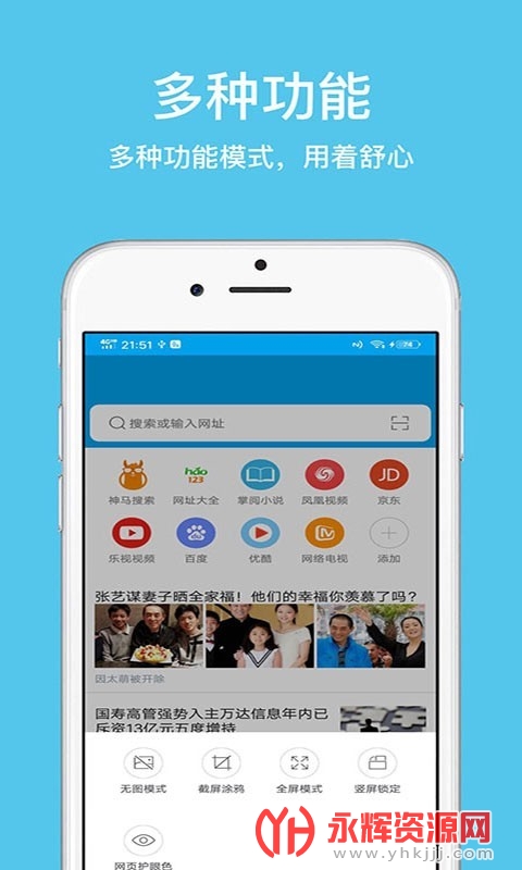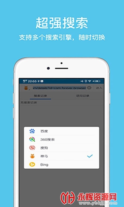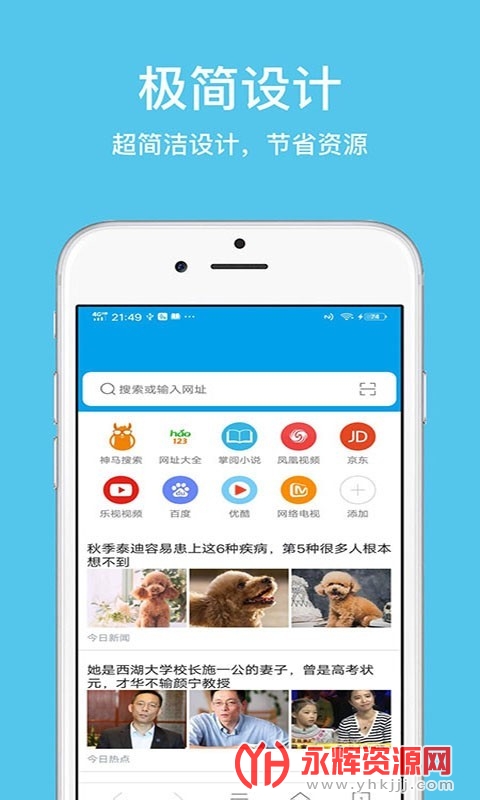 【简洁】超低内存占用,极速轻巧。支持各大主流搜索引擎。极简设计风格,没有广告、推送和过度新闻,大大的节省了您的上网流量,节省了手机内存资源,给您一个绿色的浏览器,还您一个简洁的上网环境。