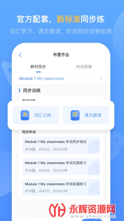提供教材配套的语音练习,用户可通过跟读或角色扮演将自己置身真实场景模拟口语练习,并通过系统评分来不断练习提升语音。