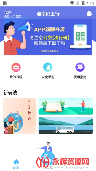淮南码上行app是一款非常好用的公交出行软件,这款软件支持二维码乘车功能,可以在乘坐公交、地铁时使用,一键扫码乘车,非常的方便快捷!为大家的出行提供了非常便利的服务!欢迎感兴趣的朋友们前来永辉资源网下载!