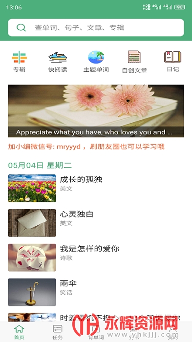 ABC英语app是一款非常实用的掌上英语学习软件,这款软件上有着海量的英语学习内容,涵盖了英语音标、语法、单词和听力等等,还汇聚了众多的英语学习教材,帮助用户们更好的进行学习,带给大家更加全面的英语学习内容,让英语学习更加高效!欢迎感兴趣的朋友们前来永辉资源网下载!