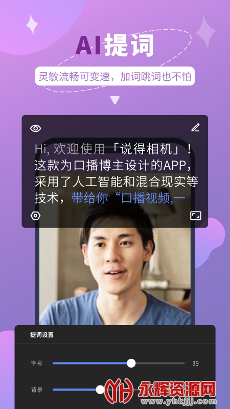 说得相机app是一款非常适合从事自媒体拍摄的朋友们提供的拍照软件,软件有着多种精美的滤镜效果以及美颜特效,还有着十分好用的提词功能,有需要的朋友们快来永辉资源网下载使用吧!