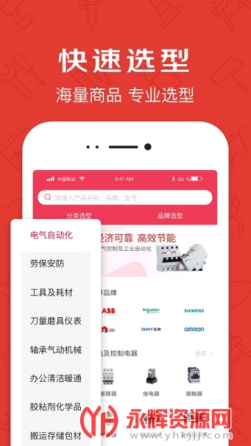 丰富的分类选型列表,分类选型栏目中有电气自动化、劳保安防以及工具耗材等类别;