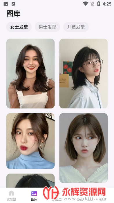 除了测脸型配发型,还有发型图库,图库里面有各种发型图片,男生发型,女生发型,儿童发型,刘海发型,发色,美发供你选择。