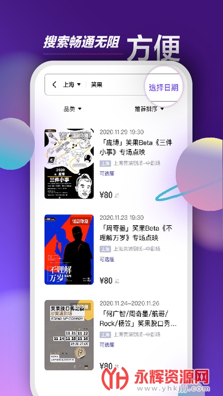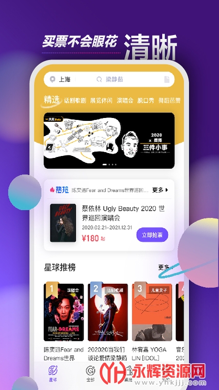 票星球买票app是一款十分优质的掌上买票平台,在这款软件中你可以购买到演唱会、艺术展览、话剧、电影票等等,而且都是非常安全的,有需要的朋友们快来永辉资源网下载使用吧!