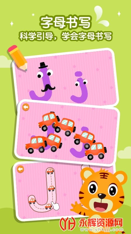- 字母描红,配合趣味动画,让孩子在玩耍中掌握字母书写笔画。