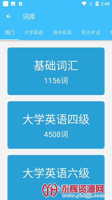 海量的词库,涵盖了高中、四级、六级、职业考试等。