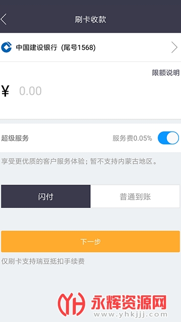 瑞和宝默认秒到,刷卡时间最好在真实商户交易时间段(早上9点到晚上9点)。刷卡时如果需要选择普通结算,在输入金额页面点击普通结算即可