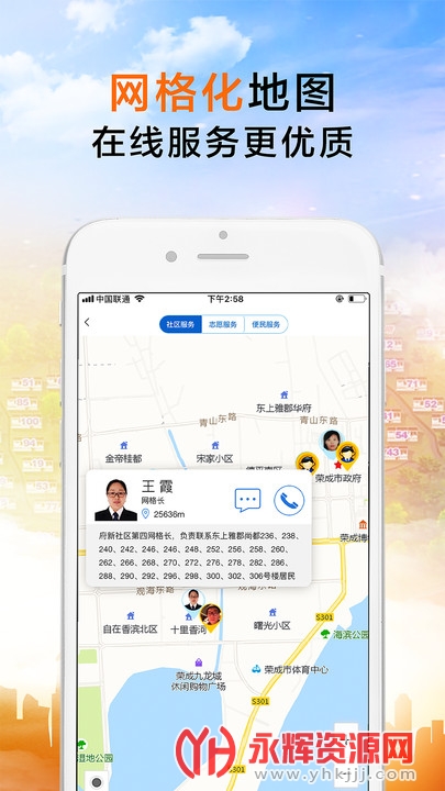 可以在线实时查看自己社区的网格长、自己小区的物业人员及整个城区范围的志愿者和便民服务商家,可在线留言,手机呼叫。
