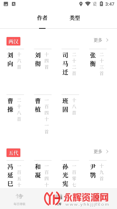 每日诗词库将诗词主要分为:作者/朝代、主题类型两大类别。