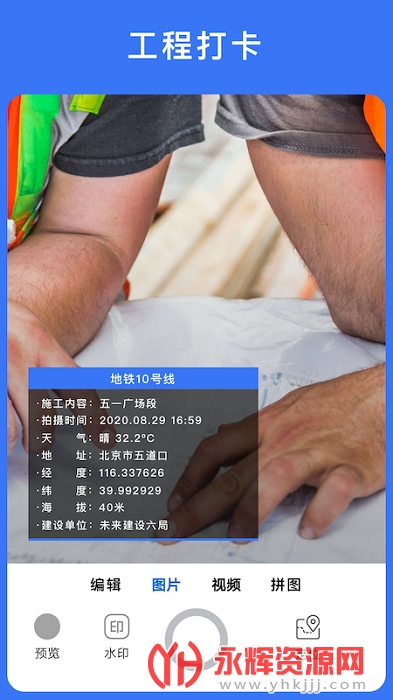 云联相机是一个可以在拍照拍视频时直接加时间、地址、经纬度、工程、天气等信息的相机,可以拍照片拍视频时直接加水印,也可以给本地照片视频加水印。