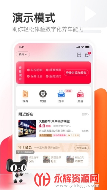 天猫养车app是一款非常好用的掌上养车生活服务手机软件,软件中为广大的车主用户带来了丰富的养车业务可以随时预约办理,并且使用起来相当的方便,一键开启定位的权限,马上就能够查询附近的门店情况,有需要的朋友就快来永辉下载体验吧!