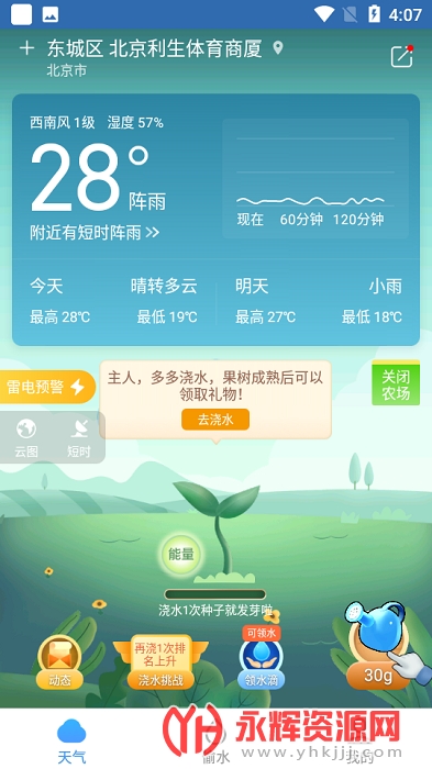 天气预报农场:每天给自己心爱的植物浇水,夏天炎热,自己也适当补水哦。