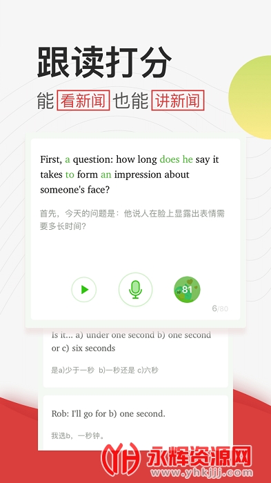 跟读打分,还有假如你跟着一起读的话,这款软件就能给你打出相应的分数的。