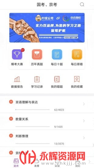 汇集近十年公务员考试国考、省考行测申论真题,覆盖五大模块、精选107个大类知识点,每道题都配有详细解析,针对考试类型配套对应直播课程。