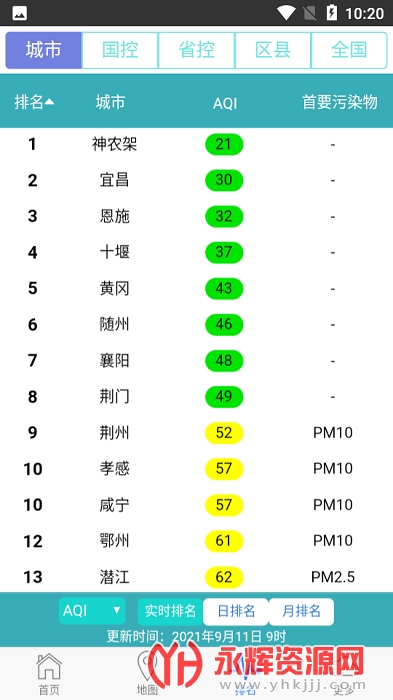 排名:增加月排名功能,AQI及污染物6参数均有相关颜色展示,排名可正序和逆序切换。