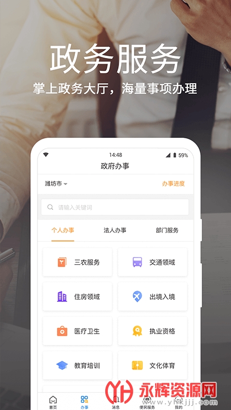 潍事通以“让数据多跑路,让群众少跑腿”为目标,依托互联网、云计算等新一代信息技术,全面整合政府和社会相关的信息资源,为市民提供便民服务、政务服务以及本地资讯服务,打造潍坊市城市服务的统一入口,以高效、高质的运营支撑移动便民服务在我市的普及,让企业及市民用一个移动端畅享城市综合服务,实现群众政务事项“指尖办理”,带领市民走进“数字生活”。