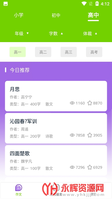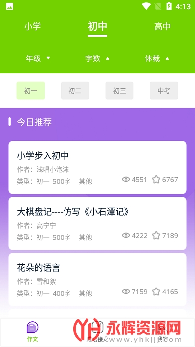 作文筛选,通过各种条件都可以筛选出喜欢的作文,让你随时都可以阅读文章。