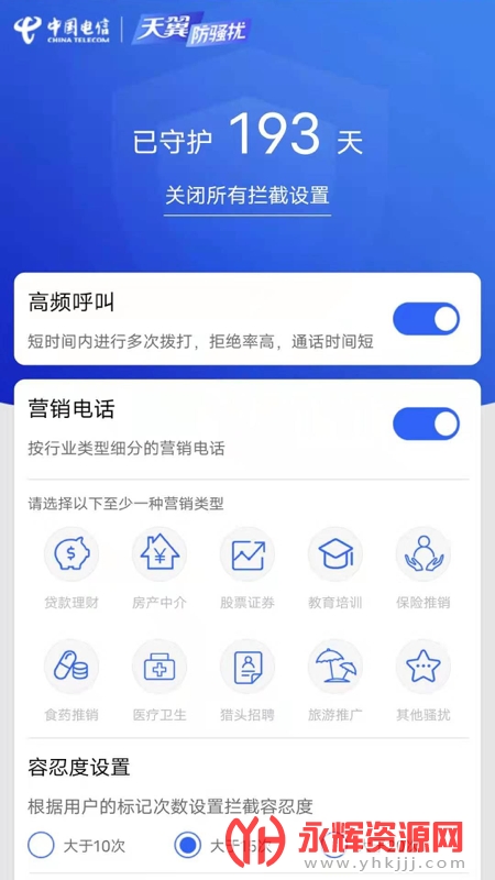 中国电信天翼防骚扰更好的帮助用户去自动拦截广告骚扰电话以及短信信息,而且还能够将拦截掉号码进行标记,你可以自定义添加到白名单当中哦,赶快前来永辉下载站体验吧!