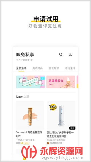 可以在线申请各种潮流、爆款、优质的产品,产品种类丰富,涵盖美妆,护肤,美食,零食,家居,设计,茶饮,酒水,生鲜以及一些新奇产品,申请是不要钱的,全程都是不要钱的,而且博主质量也很好,品牌商家通过映兔私享向平台入驻的多渠道博主发布可试用产品,而博主在体验产品后会在社交平台分享真实的使用体验。