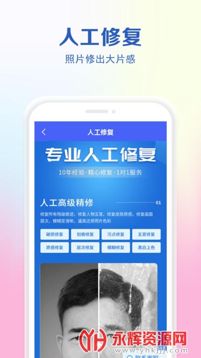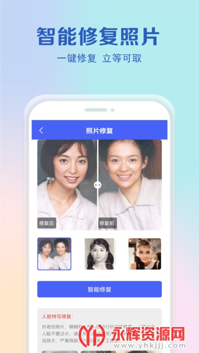 老照片还原app是一款非常好用的老照片修复软件,它可以对各种老旧照片进行一键修复,可以轻松将画质恢复至高清,还能够任意的放大照片的尺寸,让老照片变“年轻”!同时还可以修复还原各种破损照片,增强画质,让照片更清晰!欢迎感兴趣的朋友们前来永辉资源网下载!