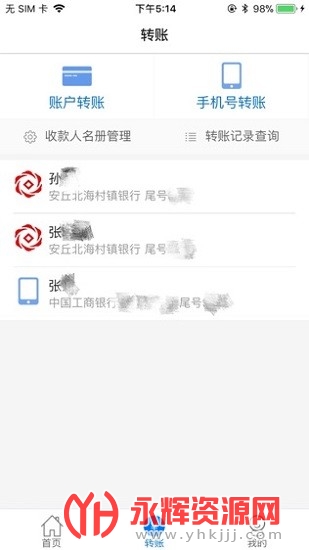 转账汇款:本人行内账户互转、行内账户转账、跨行转账、批量转账、预约转账、转账汇款记录查询、收款人账户信息