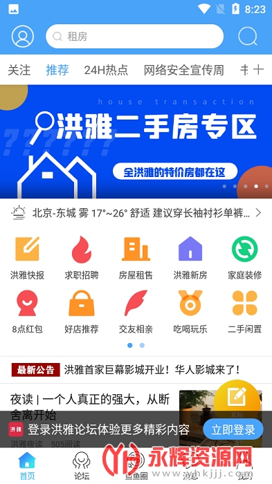洪雅论坛手机版是专为广大本地用户打造的生活服务软件,软件上不仅有着最新的本地资讯信息,还有着丰富的便民服务,涵盖了房屋租售、交友相亲和吃喝玩乐等等,各种便捷的生活服务应有尽有,可以满足大家的各种需求,同时还有着本地论坛,用户们可以随时在这里发布各种有趣好玩的经历,吸引大家点赞评论!一起互动交流!感兴趣的朋友们就来下载吧!