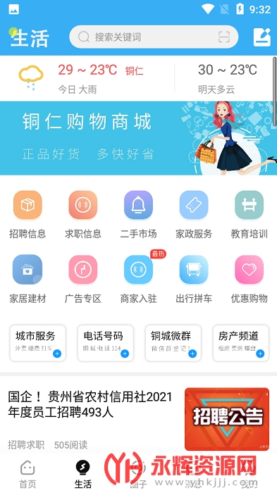 爱铜仁APP是一款专为铜仁地区打造的生活服务软件,软件上提供了丰富的本地新闻资讯,大家足不出就能够了解身边最近发生了哪些新鲜事!同时软件上还提供了各种生活服务,涵盖了求职招聘、二手市场和家政服务等等,各种便捷的生活服务应有尽有,为大家的日常生活提供了非常便利的帮助,让大家的生活更加舒适,快捷!欢迎感兴趣的朋友们前来永辉资源网下载!