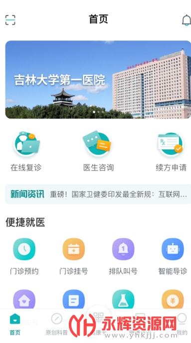 吉林大学第一医院面向患者的掌上医院APP,无广告、不收费。基于居民电子健康卡实名认证,实现“线下”-“线上”互通,将吉林大学第一医院的服务扩展到线上互联网,真正实现居民全程健康管理,实体卡虚拟化,移动便捷就医,医疗服务全面升级。