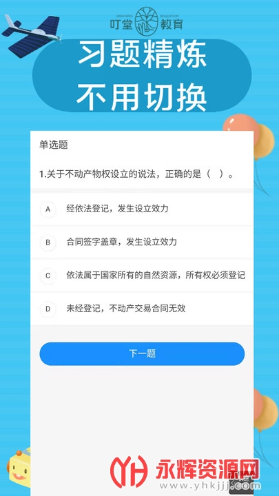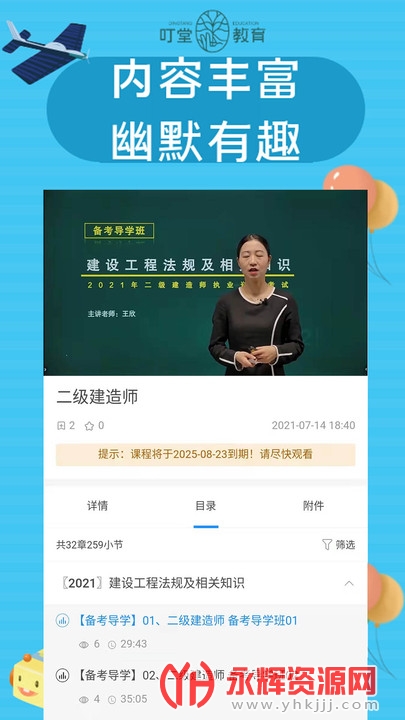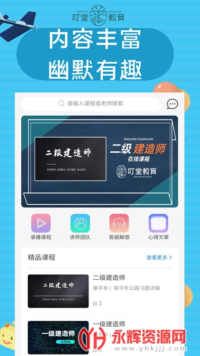 叮堂教育app是一款非常好用的在线学习软件,软件上有着丰富的二建教学资源,和众多精品在线课程,用户们可以随时在线观看学习,掌握各种知识点,还有着海量的题库资源提供给大家练习,能够有效的提升学习成绩!欢迎感兴趣的朋友们前来永辉资源网下载!