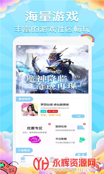 大咖玩手游平台是一款非常不错的手机游戏盒子工具软件,软件中为用户提供了非常多样的优质手游资源可以随意游玩,其中涵盖的游戏类型也是特别的丰富,能够让每一位喜欢玩游戏的朋友哦都在这里轻松找到喜欢玩的游戏,有兴趣的朋友就快来永辉下载体验吧!