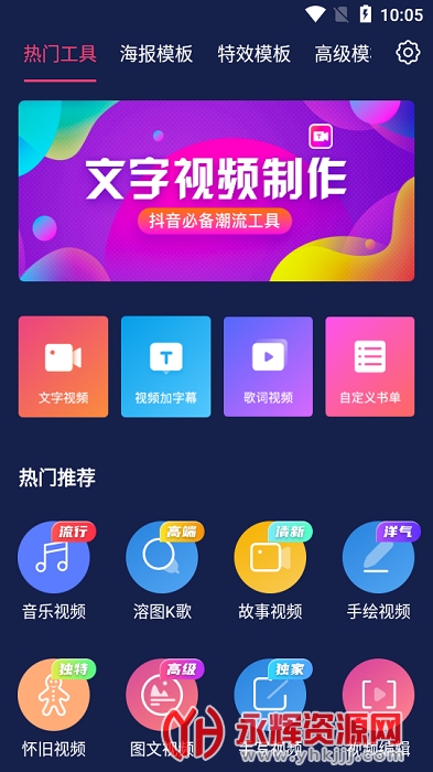 文字视频制作app是一款非常好用的视频制作软件,这款软件的功能丰富,可以轻松制作出各种有趣好玩的文字视频内容,并且还能够添加各种声音特效和文字特效,可以任意的更改文字的大小和颜色!让你的视频更加出彩!欢迎感兴趣的朋友们前来永辉资源网下载!