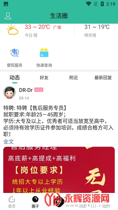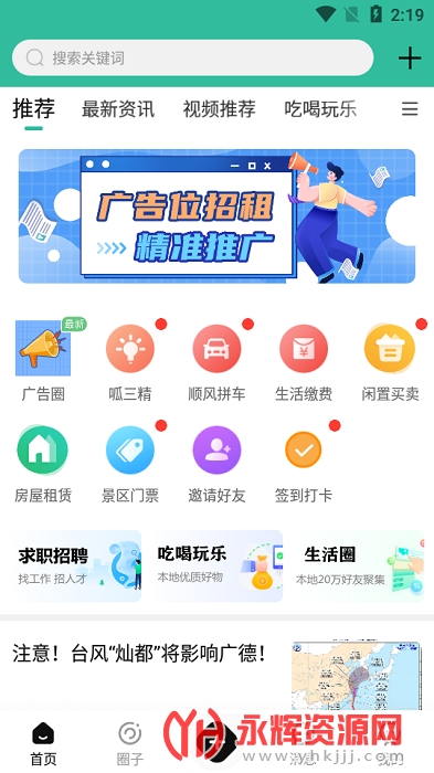 掌上广德app是一款专为广德本地打造的生活服务软件,软件上有着丰富的本地新闻资讯,用户们可以随时在线了解身边的各种资讯信息,查看各种新鲜事,同时还有着各种便捷的生活服务,涵盖了顺风拼车、闲置买卖和房屋租售等等,各种便捷的生活服务应有尽有,让大家的日常生活更加舒适!欢迎感兴趣的朋友们前来永辉资源网下载!