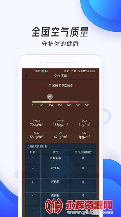 空气质量AQI、首要污染物提醒, 城市空气pm2.5、pm10数据、全国排名,为你出行、跑步等提供意见。