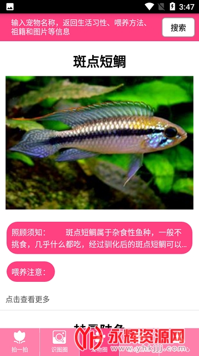 宠物搜索:一键搜索宠物,包含猫咪、犬类、爬行动物、小动物、水族类等宠物的生活习性、喂养方法、价格、祖籍、体态特点和图片等信息。