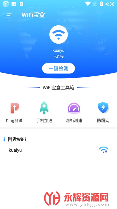 WiFi宝盒app是一款非常好用的wifi管理软件,软件上有着各种实用的功能,包含了网络测速、ping测试、手机加速和防蹭网等等,可以帮助用户们更好的管理自家的wifi,可以随时查看网速,检查wifi质量,获得更好的上网体验!欢迎感兴趣的朋友们前来永辉资源网下载!