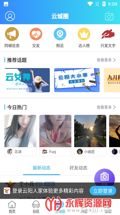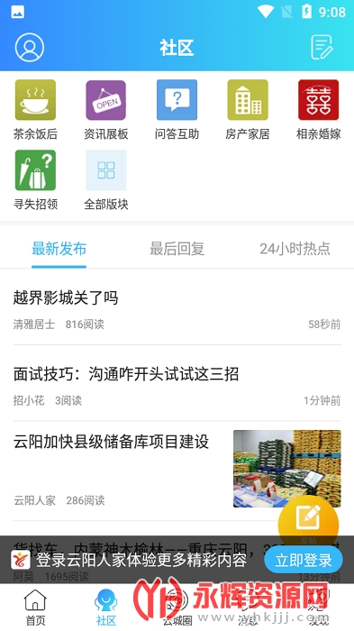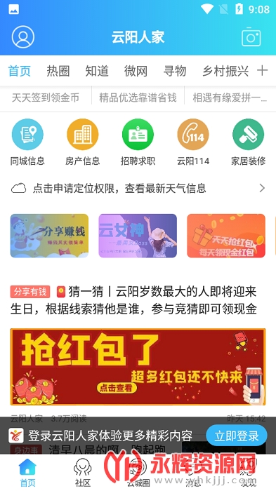 云阳人家app是一款专为云阳本地用户打造的生活服务软件,软件上有着丰富的本地资讯信息,和众多的便民服务,包含了招聘求职、家居装修和拼车出行等等,各种便捷的生活服务应有尽有,让大家的日常生活更急舒适便捷!同时还有着本地社区圈子功能,用户们可以在这里查看了解身边发生的各种事情,还能够参与讨论,和大家一起互动交流!欢迎感兴趣的朋友们前来永辉资源网下载!
