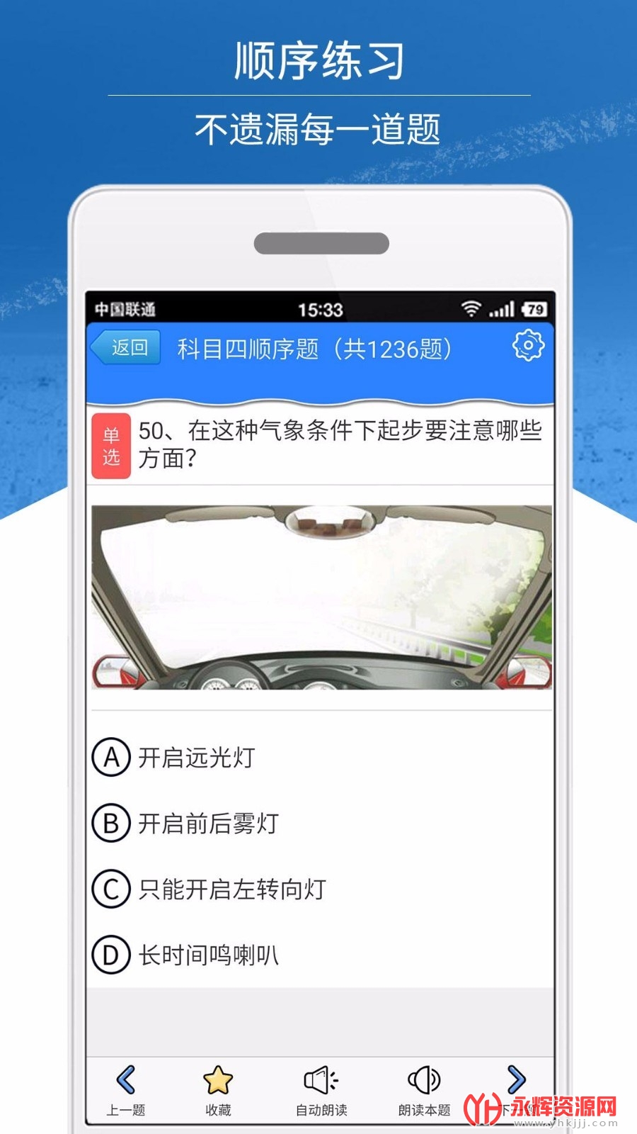 【语音朗读】具有语音朗读功能帮您声学记忆,带上耳机,在地铁、公交随时随地轻松学习,使用语音朗读功能:在练习题目界面点击右上角的设置按钮,可以设置朗读的速度,发音类型,朗读语调等,语音朗读功能是你考驾照学车的驾考宝典。