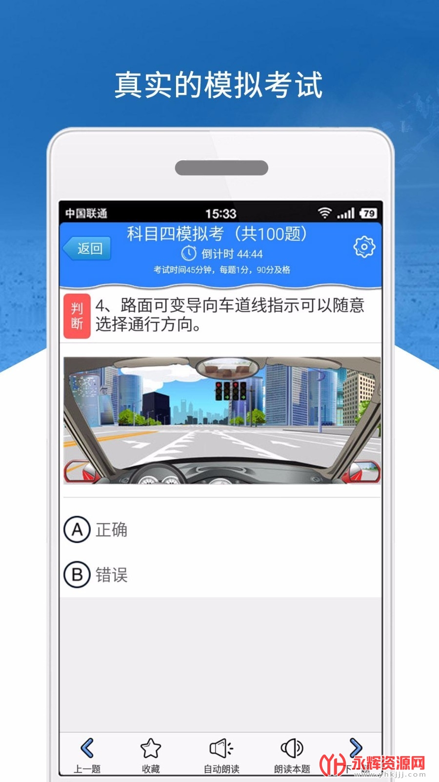语音智能学习助你通过科目四考试!科目四模拟考试练习应用包含多种练习题库方式,具有语音朗读功能,增强你的记忆功能。