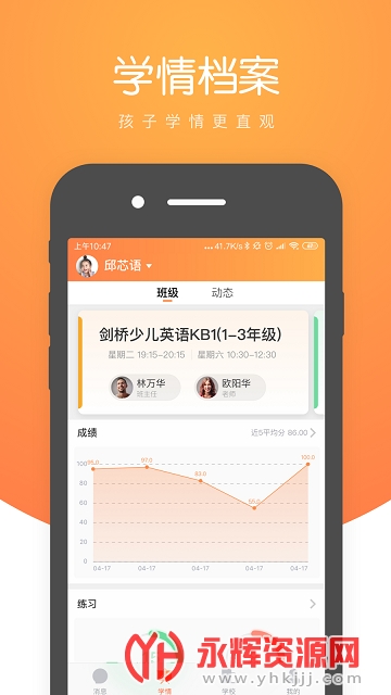 查看详细的学生在班成绩动态、练习动态、考勤动态,可接收老师布置的练习建议,并交会任务;