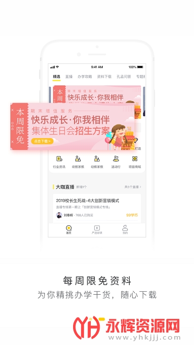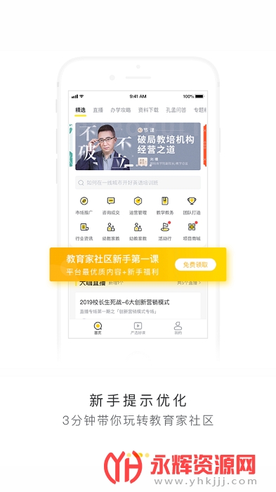 教育家社区app是教育培训机构运营管理和招生知识学习共享平台,平台上有着丰富的精品课程,还有众多的行业大师为大家在线指导,帮助大家解决各种难题!轻松学到更多的知识!欢迎感兴趣的朋友们前来永辉资源网下载!