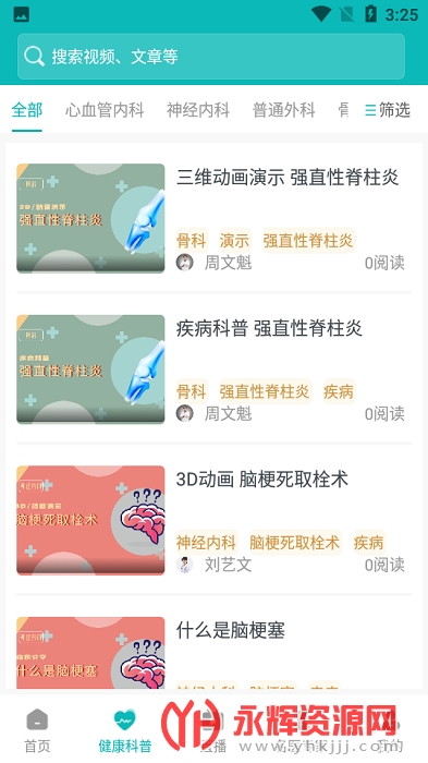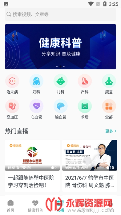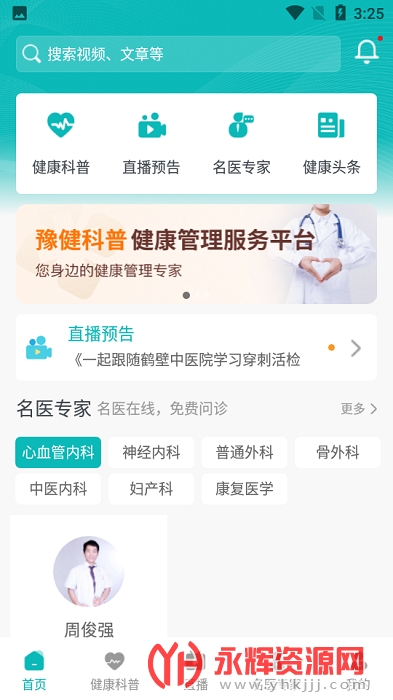 豫健科普app是一款专业的健康知识科普软件,软件上有着海量的健康知识内容,包含了健康科普、健康头条和视频直播等等,各种类型的健康知识应有尽有,可以帮助用户们了解各种健康相关的知识,能够更好的管理身体健康!提升大家的身体健康水平!软件上还有着众多的名医专家为用户们答疑解惑,解决各种健康问题!欢迎感兴趣的朋友们前来永辉资源网下载!