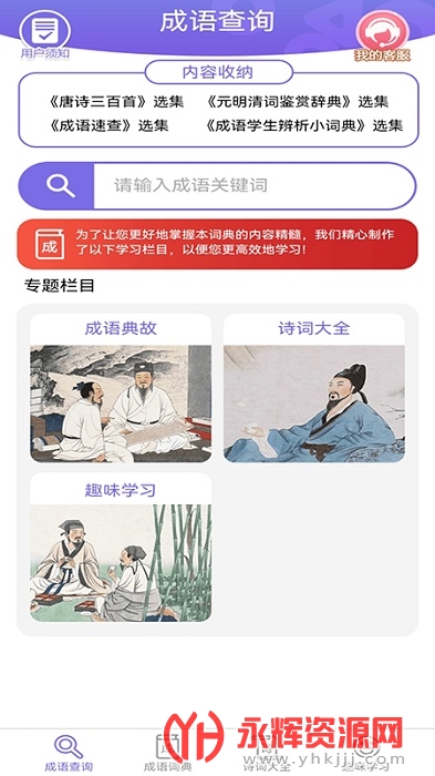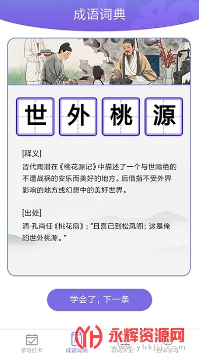 成语一百分app是一款专业的成语学习软件,软件上有着海量的成语资源,并且每一个成语都有着详细的释义,和图片说明,能够更好的帮助用户们理解学习成语的含义,掌握各个成语的用法!欢迎感兴趣的朋友们前来永辉资源网下载!