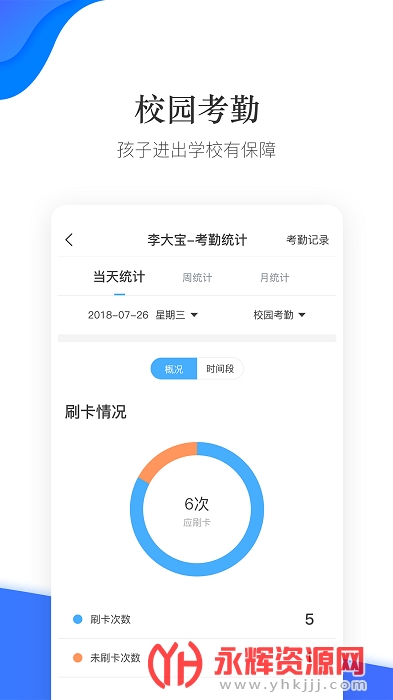 学生考勤管理:提供今日考勤管理,考勤记录管理、考勤统计(按班级和学生)功能;方便及时了解每班每生考勤情况。