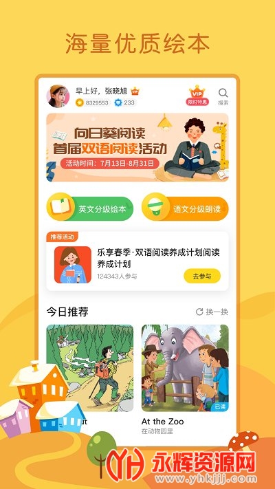 向日葵阅读app是一款极具特色的双语阅读软件,其中有着非常丰富的绘本内容,为用户带来优质的双语学习环境,用户可以根据孩子的需求,为孩子选择不同的内容阅读,从而提高双语阅读的水平,让孩子爱上阅读,有需要的朋友现在就来下载使用吧!