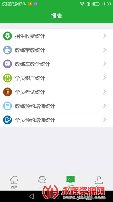 报表:实时统计招生情况、教练代教情况等。