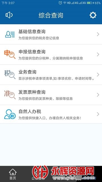 为纳税人、公众提供办税大厅地点/地图查询、税务登记信息查验、纳税信用等级查询、车船税查询、发票查验、文书查询、个税完税查验、缴款凭证查询下载等涉税查询服务。