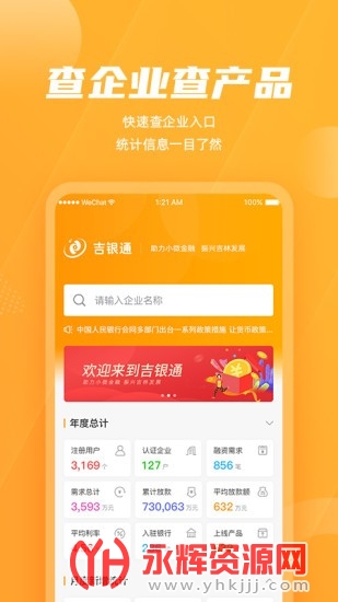 吉银通app是一款非常好用的掌上银行征信服务手机软件,软件通过了先进的互联网技术为用户打造了一个功能全面的线上银行服务平台,帮助吉林各个地区的朋友带来了办理小微企业普惠金融业务的数字化工具,特别的方便实用,有兴趣的朋友就快来永辉下载体验吧!