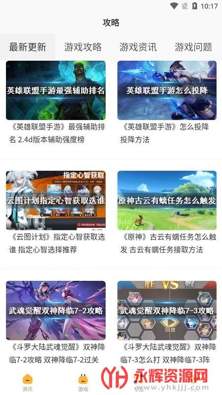 222游戏攻略app是为喜欢玩游戏的朋友们提供的应用软件,使用软件可以第一时间了解到游戏资讯,还可以学习到游戏的出装以及攻略教程,有需要的朋友们快来永辉资源网下载吧!