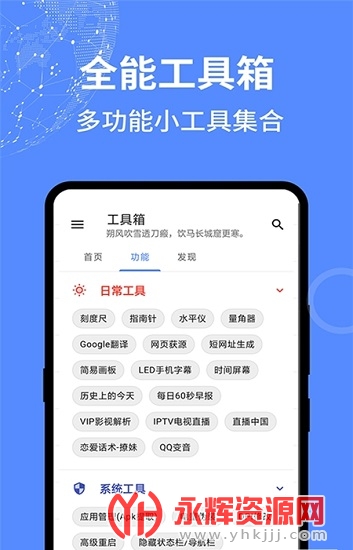该APP提供了与文字、图片、设备、清理、文件、计算、查询、相关的多种工具,基本满足您在日常使用手机时的所有工具需求。丰富的功能模块提高您的工作效率,并使您可以不用再经常寻找下载一些不怎么常用的工具app,让设备更加纯净。