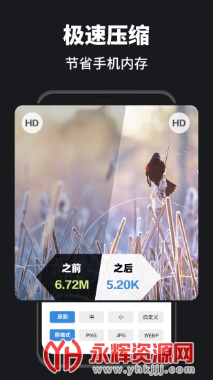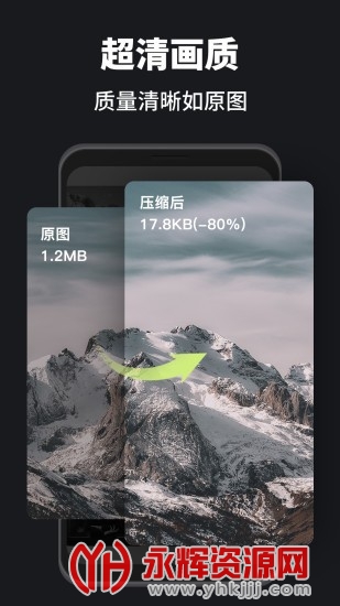 图片压缩宝app是一款十分好用的手机图片压缩工具,使用这款软件可以将手机中的图片进行压缩,让图片格式小巧来节省手机内存,有需要的朋友们快来永辉资源网下载吧!